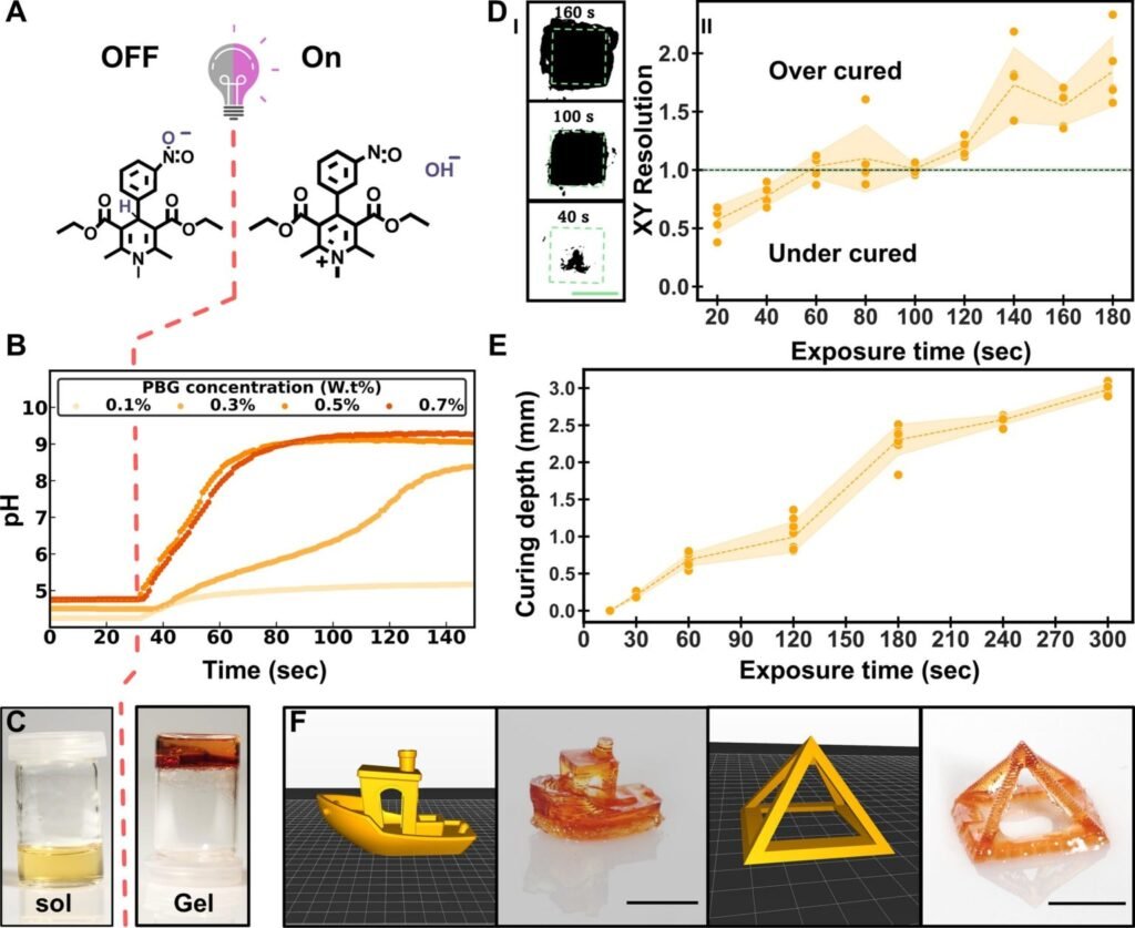 Hydrolyzed TEOS, ethanol, and distilled water in acidic conditions (pH ≈ 3) form the reactive matrix. Upon irradiation, N-methyl nifedipine produces hydroxide ions that locally shift the environment to basic conditions (pH ≈ 9), accelerating siloxane condensation. This controlled gelation mechanism allows spatially confined polymerization, enabling full 3D object formation rather than quasi-2D or nanoscale structures typical of prior binder-free techniques. The printed gels remain stable without spontaneous curing for at least one week in the absence of light, confirming precise reaction control.