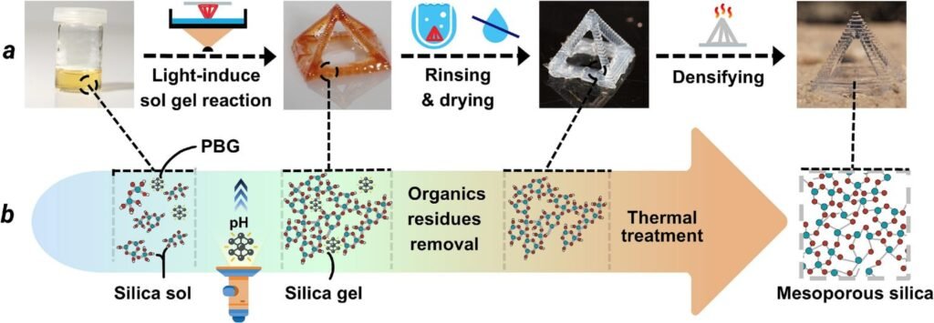 Conventional SLA glass printing methods typically disperse silica nanoparticles within organic photopolymerizable resins. These binders require oxidative removal above 600 °C, a process prone to structural defects and incomplete decomposition. Alternative binder-free approaches using hydrogen silsesquioxane or two-photon polymerization have been restricted to sub-millimeter geometries or require post-processing near 800 °C. The new method avoids these constraints by employing direct sol-gel reactions under ultraviolet irradiation, without organic monomers or sacrificial components.