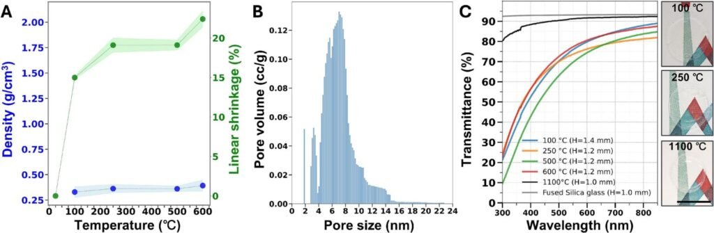Nitrogen adsorption–desorption analysis (BJH method) revealed pore sizes primarily between 4 and 8 nm. UV–Vis transmittance tests showed 80 % optical transmission in the 565–750 nm range for samples treated up to 600 °C. Further annealing at 1100 °C increased transparency to levels comparable with commercial fused silica glass (Suprasil 2B). Atomic force microscopy measurements indicated surface roughness of 71 ± 57 nm after 250 °C treatment, suggesting that densification initiates at the surface while internal porosity remains.