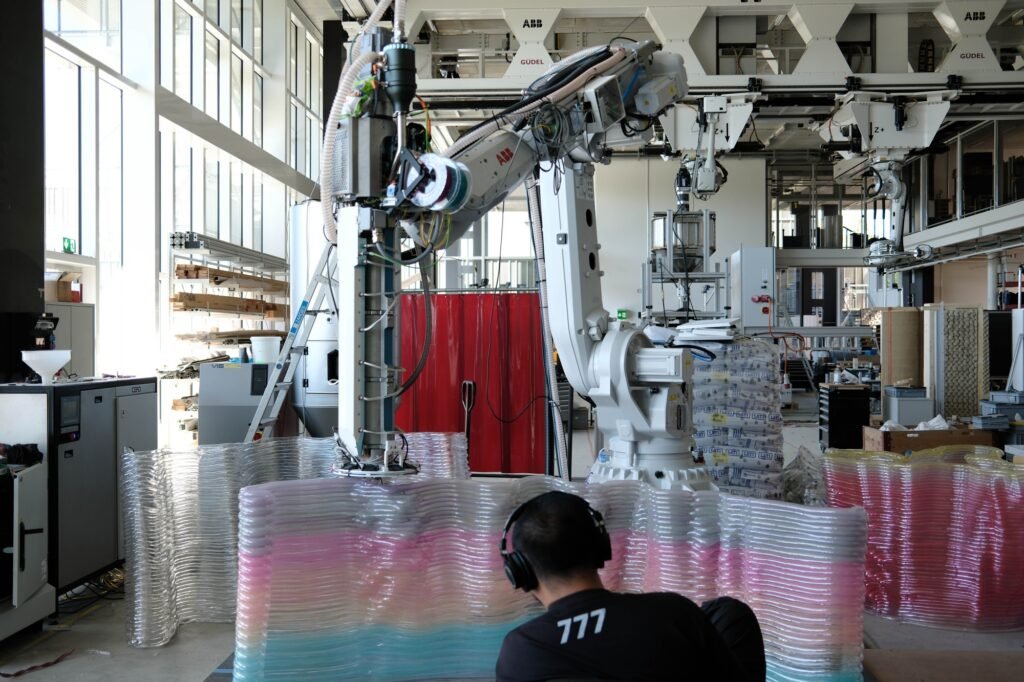 This wavy interior was created by students from ETH Zurich’s Master of Advanced Studies (MAS) in Architecture and Digital Fabrication program using a technique called Hollow-Core 3D Printing (HC3DP). Developed at ETH’s Robotic Fabrication Lab, HC3DP is a large‑scale, robotic pellet extruder that prints recycled PETG plastic in long, hollow tubes instead of solid lines. This makes the structure lighter, faster to print, and more material-efficient.