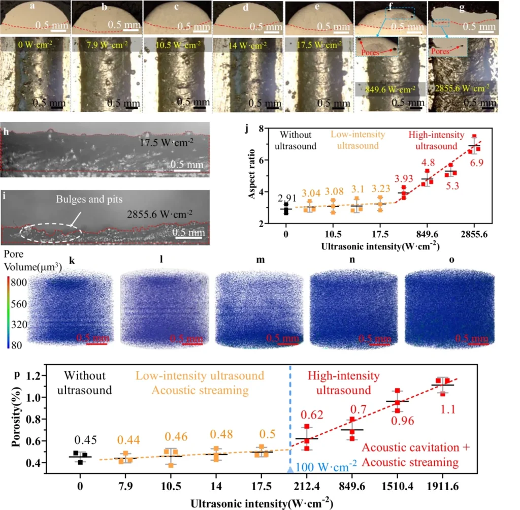 In-situ monitoring and multiphysics simulations clarified the physical mechanism. Low-intensity ultrasound combined with Marangoni-driven flow to generate a high-frequency shaking motion in the melt pool. This motion subjected dendrite arms to cyclic stresses exceeding the material’s 37.3 MPa yield strength, causing fatigue fracture and fragmentation. Calculations showed dendrite stress rising from 30.9 MPa without ultrasound to 71.3 MPa under non-contact ultrasound. Unlike cavitation, which produces violent bubble collapse and shock waves, acoustic streaming maintained a stable melt pool surface. Porosity under low-intensity conditions rose only marginally, from 7.9 to 17.5 W·cm², confirming that defects were avoided while refinement occurred.