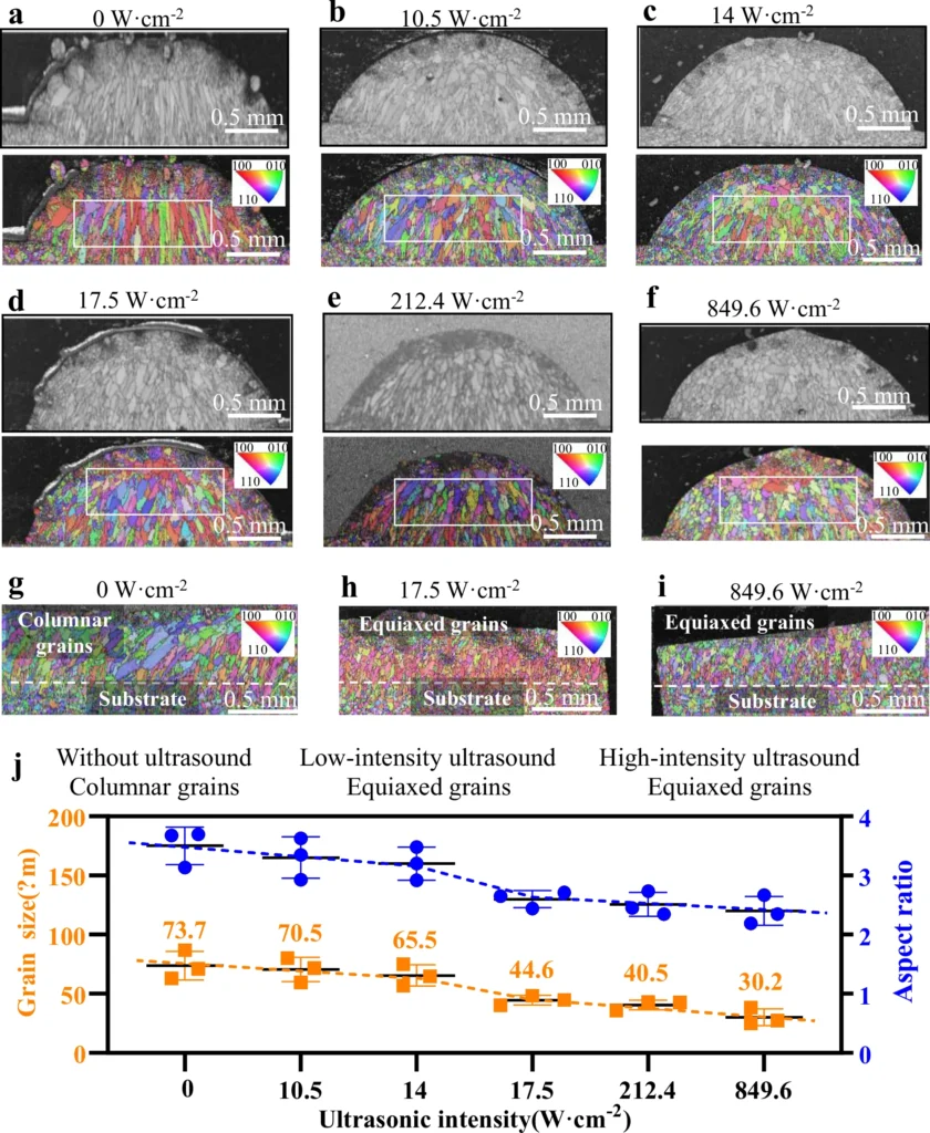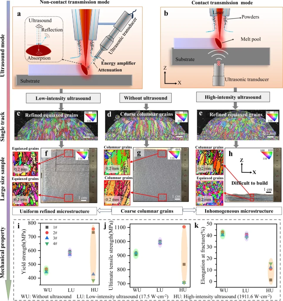 Northwestern Polytechnical University’s team mounted the transducer to the powder nozzle, keeping a fixed distance from the melt pool as layers were deposited. This configuration ensured stable ultrasound delivery across heights, producing uniform equiaxed structures. Grain size analysis showed an average of 73.7 μm without ultrasound, reduced to 44.6 μm with non-contact ultrasound at 17.5 W·cm². Contact ultrasound achieved finer grains of 30.2 μm at 849.6 W·cm², but porosity and surface defects increased sharply. Grain transition points also differed: equiaxed grains appeared above 1.0 mm in non-contact samples compared to 0.6 mm in high-intensity builds. Contact-transmission effects weakened above 10 mm, where grains reverted to columnar structures, while the nozzle-mounted method preserved refinement throughout 100 mm blocks.